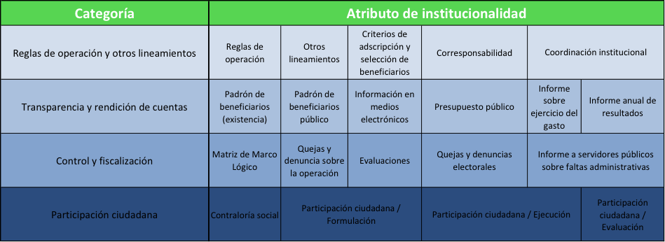 Por medio de IPRO, se pueden llevar a cabo distintos análisis de los programas sociales a nivel federal y por entidades federativas. Asimismo, a partir de la existencia o no de 20 atributos mínimos en los programas sociales, se obtienen indicadores de institucionalidad con valores entre el 0 y el 1, a partir de un autodiagnóstico que responden las y los operadores de más de 2,700 programas sociales. Los indicadores de institucionalidad se agrupan en cuatro categorías: reglas de operación y otros lineamientos, mecanismos de transparencia y rendición de cuentas, mecanismos de control y fiscalización, y mecanismos de participación social.