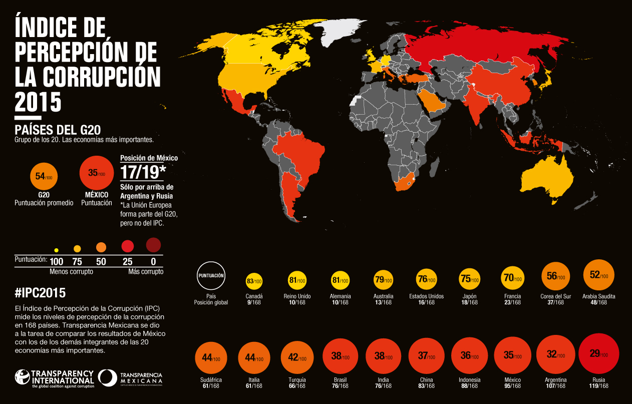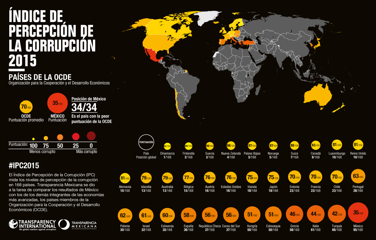 En el Índice de Percepción de la Corrupción 2015, cuya escala va de 0 (percepción de altos niveles de corrupción) a 100 puntos (percepción de bajos niveles de corrupción), México obtuvo una puntuación de 35, que lo ubica en la posición 95, junto con Armenia, Filipinas y Mali.