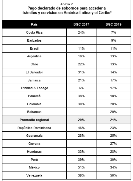 El Barómetro Global de la Corrupción 2019 muestra que en América Latina y el Caribe, 1 de cada 5 personas (21%) tuvo que pagar un soborno para acceder a algún trámite o servicio (los resultados completos sobre experiencias de corrupción aparecen en el Anexo 2).