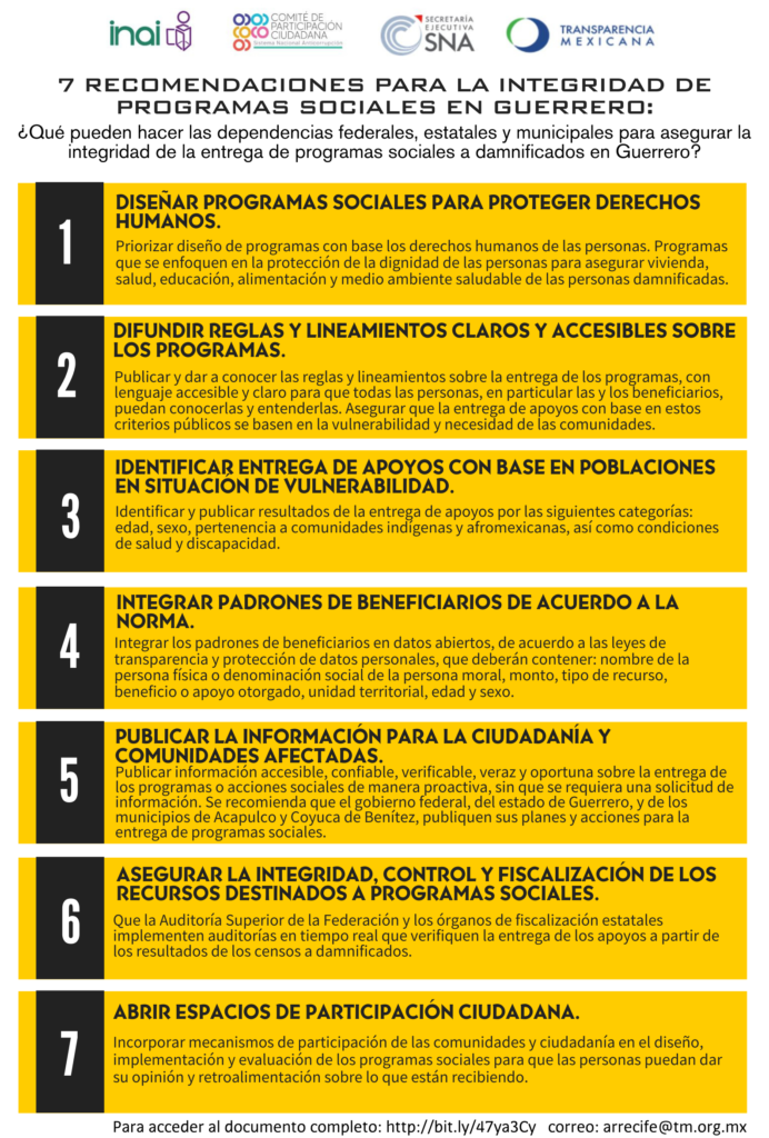 El Instituto Nacional de Transparencia, Acceso a la Información y Protección de Datos Personales (INAI), la Secretaría Ejecutiva del Sistema Nacional Anticorrupción (SESNA), el Comité de Participación Ciudadana del Sistema Nacional Anticorrupción (CPC-SNA) y Transparencia Mexicana proponen 7 medidas para mantener la integridad en la operación y entrega de programas sociales durante la reconstrucción de Acapulco y Coyuca.
