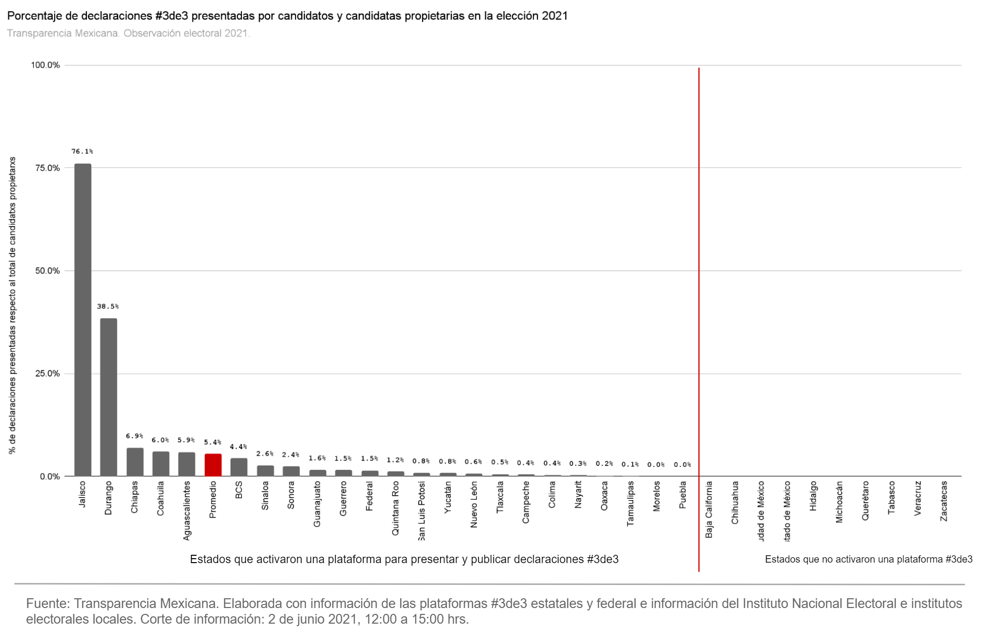 18% (21 de 117) de candidatas y candidatos a una gubernatura presentaron su declaración #3de3, declaración patrimonial, de intereses y fiscal. Esto contrasta con la elección 2018, cuando el 73% de quienes compitieron por una gubernatura presentaron su declaración #3de3 en una plataforma abierta a la ciudadanía para que los y las electoras comparen la información de quienes buscaban su voto.