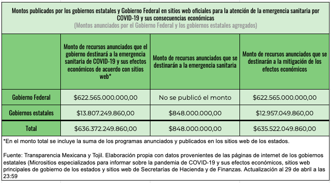 – Al 29 de abril de 2020, Transparencia Mexicana y Tojil identificaron más de 636 mil millones de pesos anunciados en páginas oficiales de los gobiernos federal y estatales